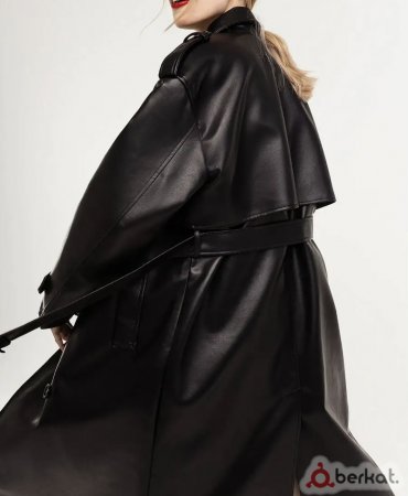 Длинный двубортный плащ свободного кроя из искусственной кожи- Застежка на пуговицы-