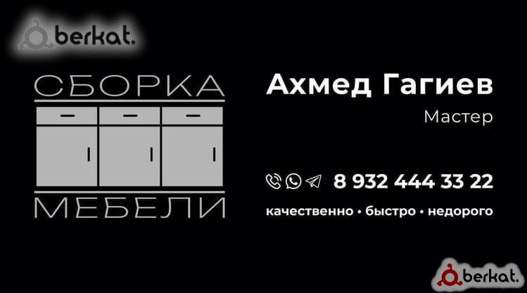 Услуги: — Сборка новой мебели ( кухни, шкафы, столы и др.). — Ремонт: замена фурнитуры, петель, ручек; укрепление конструкций, починка ящиков/дверей. ? Преимущества: • Работаю быстро и аккуратно. • Гарантия на все виды работ. • Доступные цены (договорные, прайс по запросу). ? Примеры работ и отзывы — предоставлю по запросу! ? Звоните/пишите: Телефон: +7(988)1297778 +7 988 801-54-42 WhatsApp:+7(962)1690371 ? Работаем без выходных! Сроки: • Сборка — от 2 часов (в зависимости от сложности). • Ремонт — в течение дня