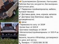 ? Грузоперевозки Долаково, Кантышево. Работаю быстро, аккуратно, без выходных. Доступные цены. ✔️ Перевозка стройматериалов, мебели, бытовой техники ✔️ Доставка дров, сена, кормов, металла ✔️ Доставка газа (баллоны), воды (по договорённости) ? Цены: • Перевозка по селу: от 300₽ • Более 5км: от 500 ₽ • Доставка газа/воды: от 300 ₽ • Металлолом/стройматериалы: от 500 ₽ за поездку Звоните, пишите в WhatsApp, договоримся по цене, всё честно. ? Телефон: +7 (929) 886 36 98